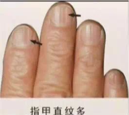 指甲纵纹——神经衰弱指甲上有数条明显纵纹表示长期神经衰弱、机体衰老的象征。