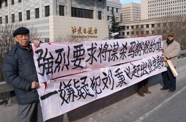 41年血案未昭,而当年江青的红人,嫌犯刘秉义频频登台演出亮相,四处招摇过市,尤其是年年还要参加北京电视台的春晚,令马豁然的哥哥马青柯和弟弟马波(老鬼))极其愤懑,2月2日终于被迫上街拉横幅,要求杀人嫌犯退出北京台的春晚。