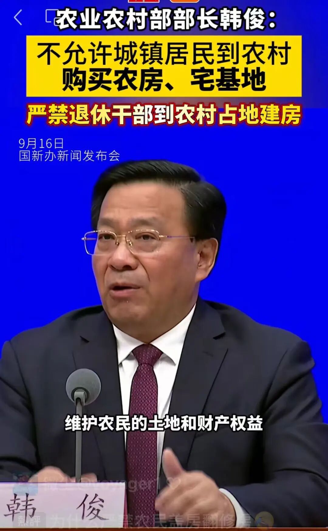 直接引起我的纠结的,是2025年9月16日网络消息,农业农村部长韩俊“重申”:“不允许城镇居民到农村购买农房、宅基地,严禁退休干部到农村占地建房”。报道还有一句——“韩俊部长特别强调,这一政策的初衷是为了更好地维护农民的土地和财产权益”