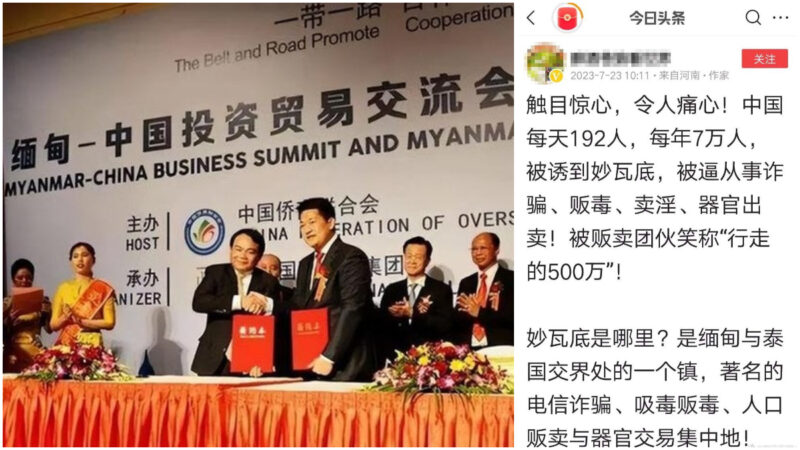 左图为亚太城当年的宣传照,前排右边为亚太城老板、中国侨商联合会副会长佘智江。亚太城位于缅甸妙瓦底地区。(网络图片)