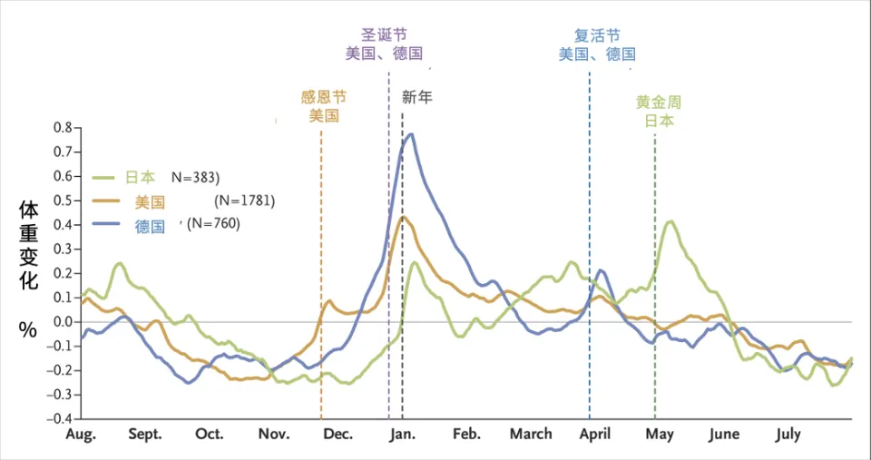 抛开“不爱动”“很想吃”这些看起来和天冷、意志力有关的事,研究者发现,每一个体重波峰几乎都迎合上了各个国家的节假日。