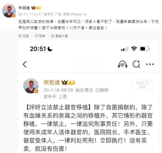 这条看不到的微博是宋祖德2023年1月16日发的,帖文内容是:“【呼吁立法禁止器官移植】除了自愿捐献的,除了有血缘关系的亲属之间的移植外,其它情形的器官移植,一律禁止,一律追究刑事责任!另外,只要使用未成年人活体器官的,医院院长、手术医生、器官受体人,一律判处死刑!立即执行!没有买卖,就没有伤害!”