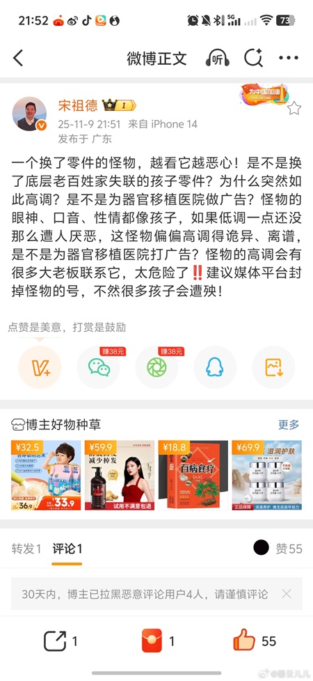 而在日前(11月9日),宋祖德发文说,“一个换了零件的怪物,越看它越恶心!是不是换了底层老百姓家失联的孩子零件?为什么突然如此高调?是不是为器官移植医院做广告?怪物的眼神、口音、性情都像孩子,如果低调一点还没那么遭人厌恶,这怪物偏偏高调得诡异、离谱,是不是为器官移植医院打广告?怪物的高调会有很多大老板联系它,太危险了!建议媒体平台封掉怪物的号,不然很多孩子会遭殃!”