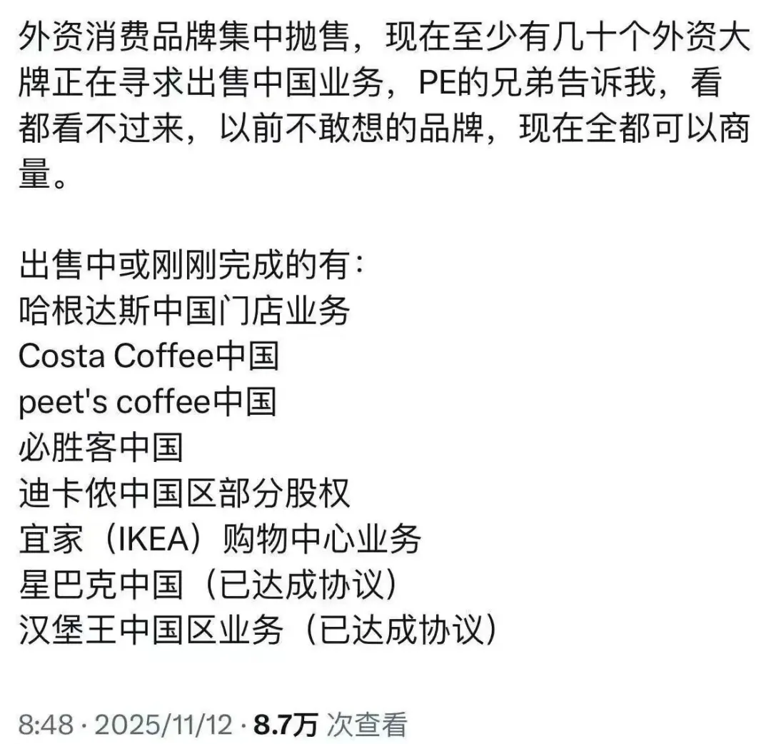 今天很多人都在讨论一个截图,为什么那么多外资消费大牌都要甩卖呢?