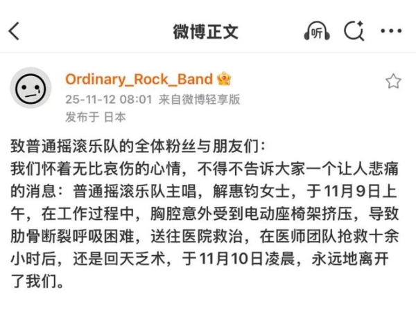 11月12日,独立乐队“普通摇滚乐队”微博账号发布讣告称,乐队主唱解惠钧(艺名阿珍)9日上午在工作过程中,胸腔意外受到电动座椅架挤压,导致肋骨断裂呼吸困难,被送往医院救治十几个小时,最终于10日凌晨去世。