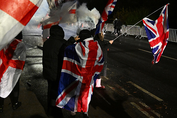 2025年11月11日,人们在贝尔酒店外挥舞旗帜和横幅进行抗议。(Leon Neal/Getty Images)