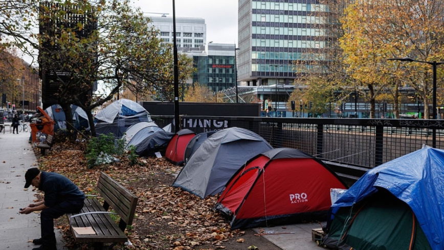 2025年11月13日:在伦敦尤斯顿路,大学学院医院对面,路边搭满了帐篷。伦敦的露宿街头人数创下历史新高,去年记录在案的露宿者超过13,000人,比前一年增加了27%。伦敦议会2024年的报告显示,数百名难民在离开内政部饭店后流落伦敦街头,其中90%的人曾获得庇护申请批准。