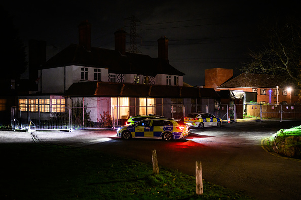 2025年11月11日,法院裁定移民可以入住埃平贝尔饭店后,警车停在饭店外的停车场。埃平森林区议会先前反对在贝尔酒店安置移民的法律诉讼败诉。今年夏天,一名居住在该酒店的寻求庇护者因性犯罪被捕,后来被判入狱,此后该酒店成为激烈抗议和反抗议活动的焦点。(Leon Neal/Getty Images)