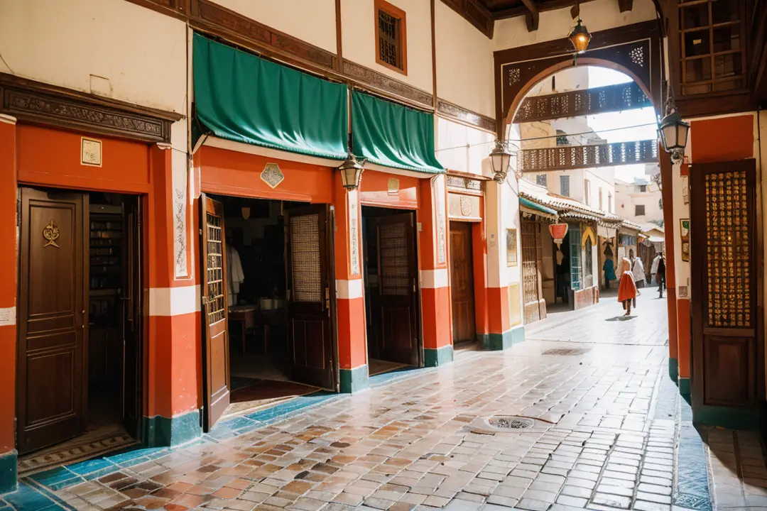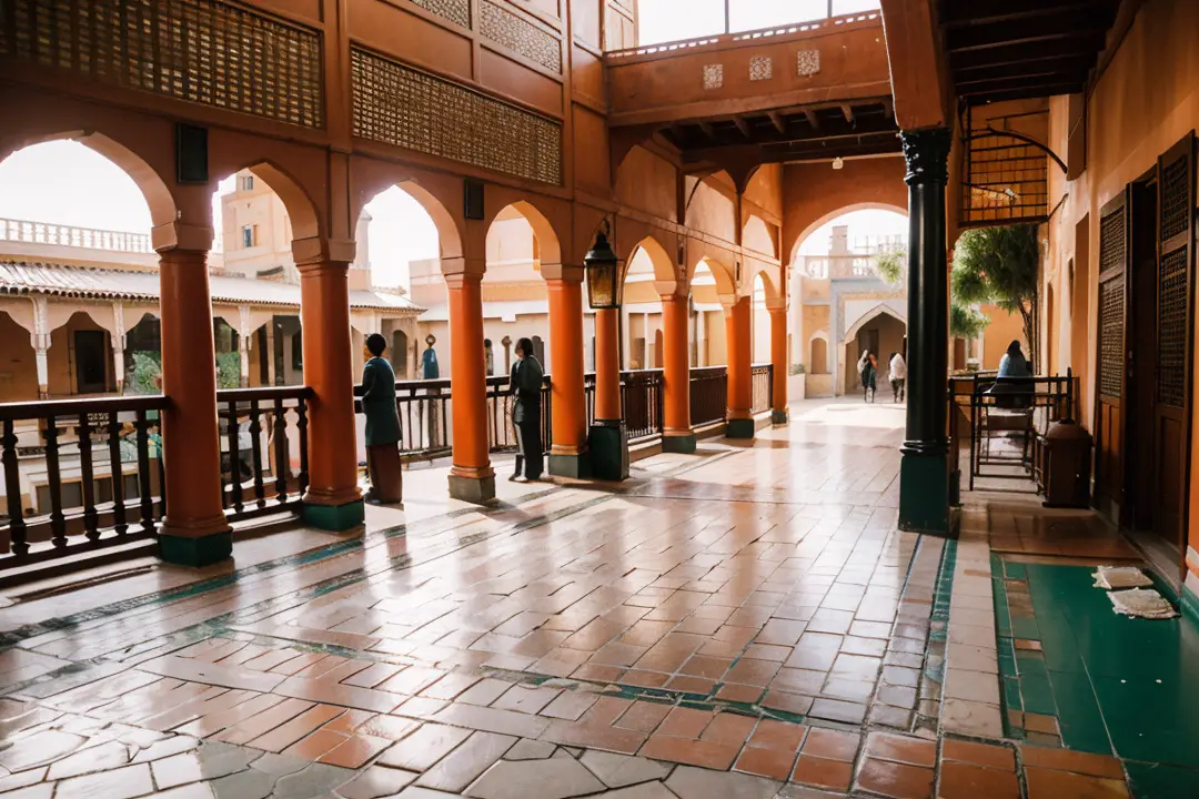 清晨,广场还未完全热闹,空气中弥漫着香料、烤面包与清晨露水的气息。红色建筑在晨光中泛着暖色,街道石板铺就,光影交错。远处的摩洛哥民居和清真寺塔楼在阳光下轮廓分明,仿佛将古老与现代交织在一起。我漫步在街道上,聆听市场早起的吆喝声与街头乐器的低吟,感受城市初醒的活力。