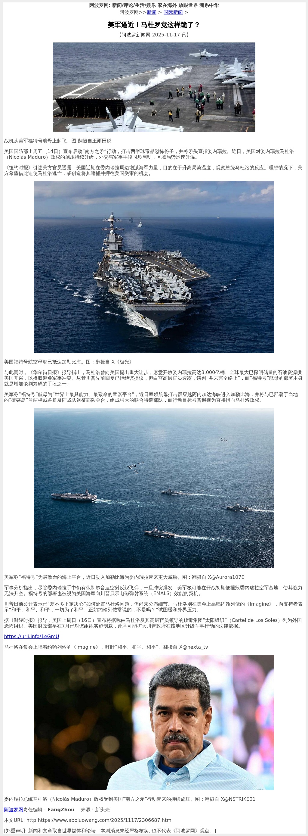 美军称“福特号”航母为“世界上最具能力、最致命的武器平台”,近日率领航母打击群穿越阿内加达海峡进入加勒比海,并将与已部署于当地的“硫磺岛”号两栖戒备群及陆战队远征部队会合,组成强大的联合特遣部队,而行动目标被普遍视为直接指向马杜洛政权。