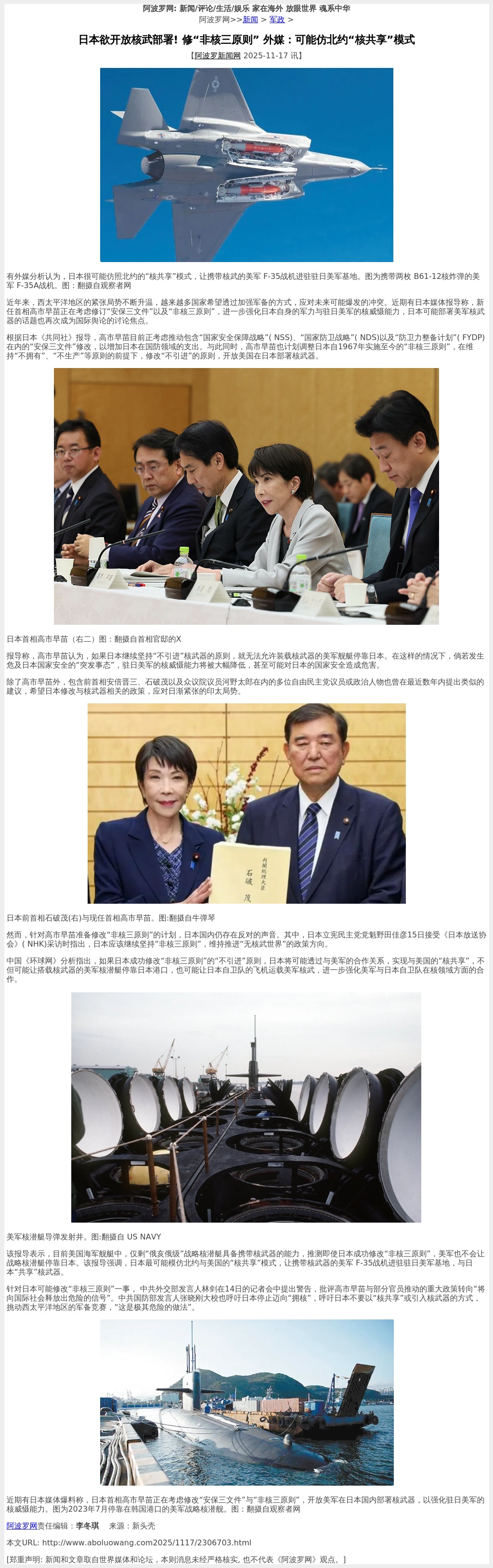该报导表示,目前美国海军舰艇中,仅剩“俄亥俄级”战略核潜艇具备携带核武器的能力,推测即使日本成功修改“非核三原则”,美军也不会让战略核潜艇停靠日本。该报导强调,日本最可能模仿北约与美国的“核共享”模式,让携带核武器的美军 F-35战机进驻驻日美军基地,与日本“共享”核武器。
