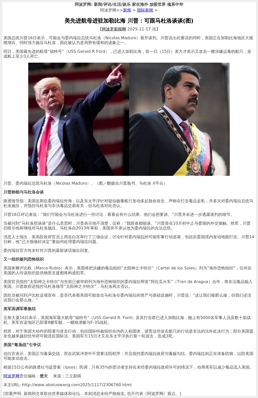 同日,美国最先进的航母“福特号”(USS Gerald R Ford),已进入加勒比海,前一日(15日)美方才表示又攻击一艘涉嫌运毒的船只,造成船上至少3人死亡。