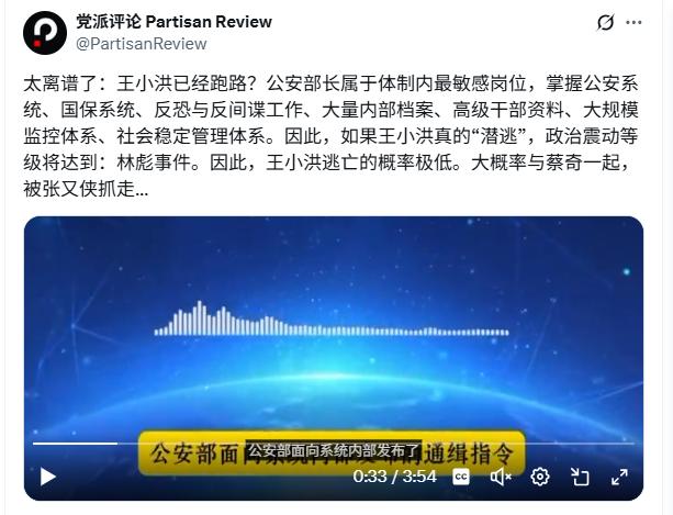 太离谱了:王小洪已经跑路?公安部长属于体制内最敏感岗位,掌握公安系统、国保系统、反恐与反间谍工作、大量内部档案、高级干部资料、大规模监控体系、社会稳定管理体系。因此,如果王小洪真的“潜逃”,政治震动等级将达到:林彪事件。因此,王小洪逃亡的概率极低。大概率与蔡奇一起,被张又侠抓走…