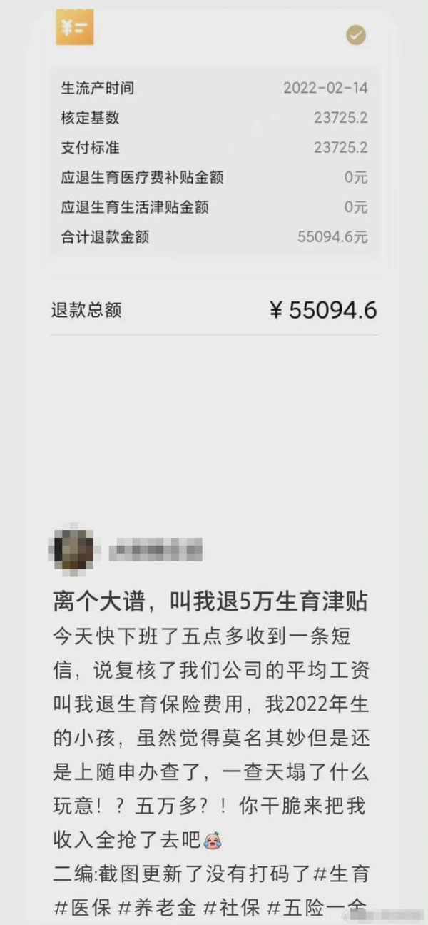 许多上海妈妈爆料,收到要求退回生育津贴的官方通知。(网络截图)