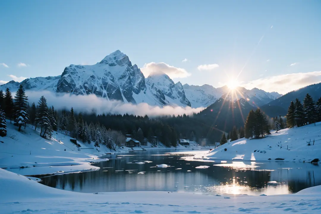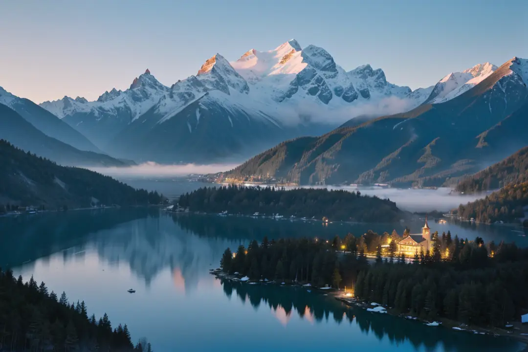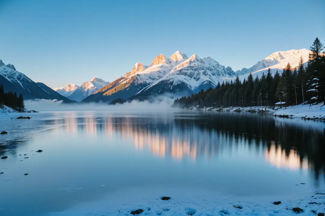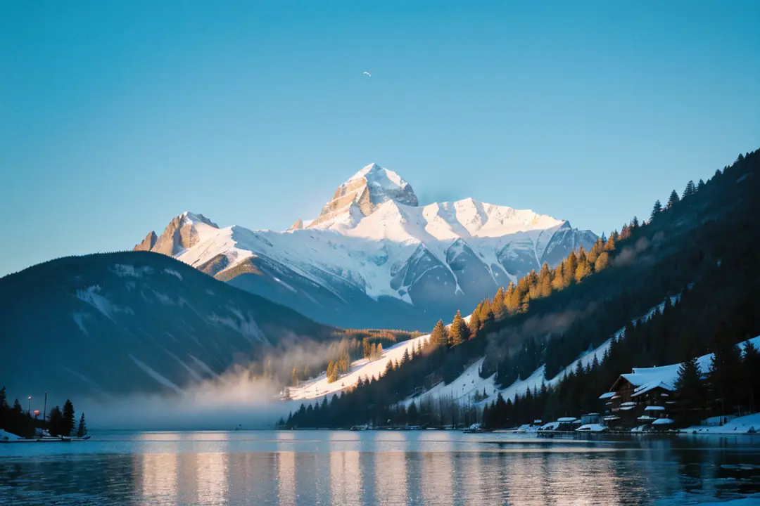 空气清冽而纯净,带着雪山的寒气与湖水的湿润气息,深吸一口,沁人心脾。随着第一缕阳光刺破天际,金色的光线洒向雪山峰顶,瞬间将雪峰染成耀眼的金红色,与湖面的蓝、岸边的绿构成强烈的色彩对比,美得神圣而静谧。晨雾慢慢散去,小镇的木质建筑逐渐显露,红色的屋顶与白色的墙壁在晨光中格外显眼,宛如童话世界。