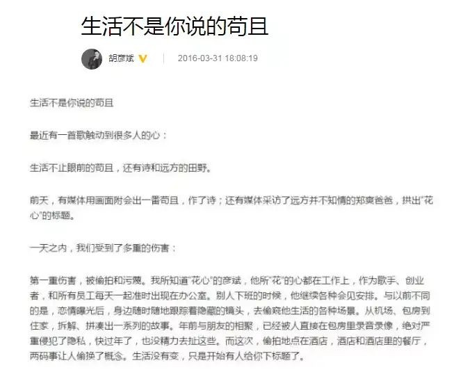 女方父母对这段感情的迅速切割,也让外界对胡彦斌的态度越来越差。