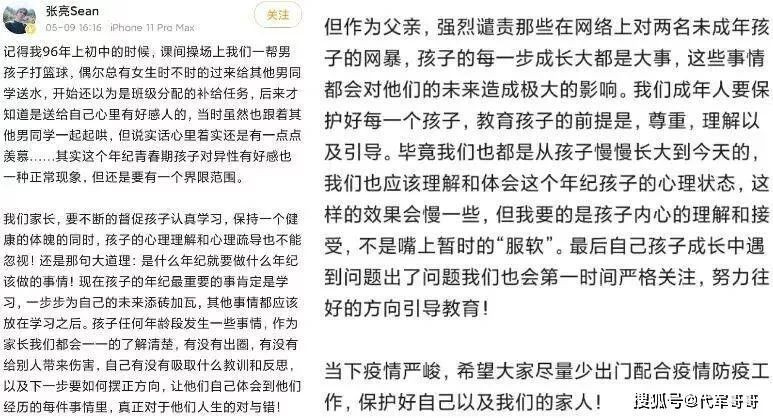 回国后,张亮并未像一些家长那样,公开苛责儿子。相反,他展现出了极大的理解与包容。他在长文中坦诚地分享自己青春期时,对异性也有着懵懂的好感,回忆起初中课间打篮球时,女同学给有好感的男同学送水,自己虽跟着起哄,内心却也有些羡慕。他强调,在这个年纪,青春期孩子对异性有好感是再正常不过的现象,重要的是要把握好界限。他承诺会好好引导儿子,让他学会责任与分寸,同时也谴责了那些对两个未成年孩子进行网暴的行为,呼吁大家尊重孩子、理解孩子的心理。