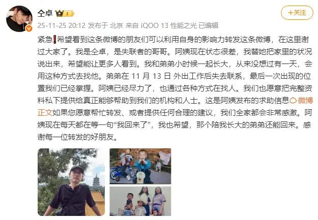 25日,仝卓在社交平台上发求助文,称弟弟外出打工后失联!他表示:“紧急!我是仝卓,是失联者的哥哥。阿姨现在状态很差,我替她把家里的状况说出来,希望能让更多人看到。我和弟弟小时候一起长大,从来没想过有一天,会用这种方式去找他。弟弟在11月13日外出工作后失去联系,最后一次出现的位置我们已经掌握。阿姨已经尽力了,也通过各种方式在找人。我们也愿意把完整资料私下提供给真正能够帮助到我们的机构和人士。这是阿姨发布的求助信息,如果您愿意帮忙转发、或者提供任何合理的建议,我们全家都会非常感激。阿姨现在每天都在等一句‘我回来了’,我也希望,那个陪我长大的弟弟还能回来。感谢每一位转发的好朋友。”