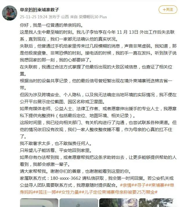 据“单亲妈妈柬埔寨救子”发布的信息显示,其儿子李怡亨最后信号曾短暂出现在境外柬埔寨班迭棉吉省一带,“失联后,他曾通过手机给家里传来过几段模糊的消息,声音非常虚弱。”“直到现在,我们一家都无法确认他的真实状况。”