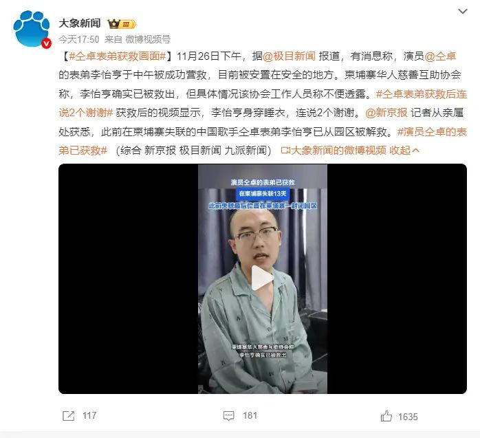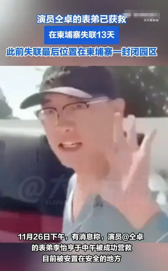 (综合:新京报,极目新闻,九派新闻,大象新闻) 11月26日下午,据极目新闻报道,有消息称,演员仝卓的表弟李怡亨于中午被成功营救,目前被安置在安全的地方。柬埔寨华人慈善互助协会称,李怡亨确实已被救出,但具体情况该协会工作人员称不便透露。获救后的视频显示,李怡亨身穿睡衣,连说2个谢谢。新京报记者从亲属处获悉,此前在柬埔寨失联的中国歌手仝卓表弟李怡亨已从园区被解救.