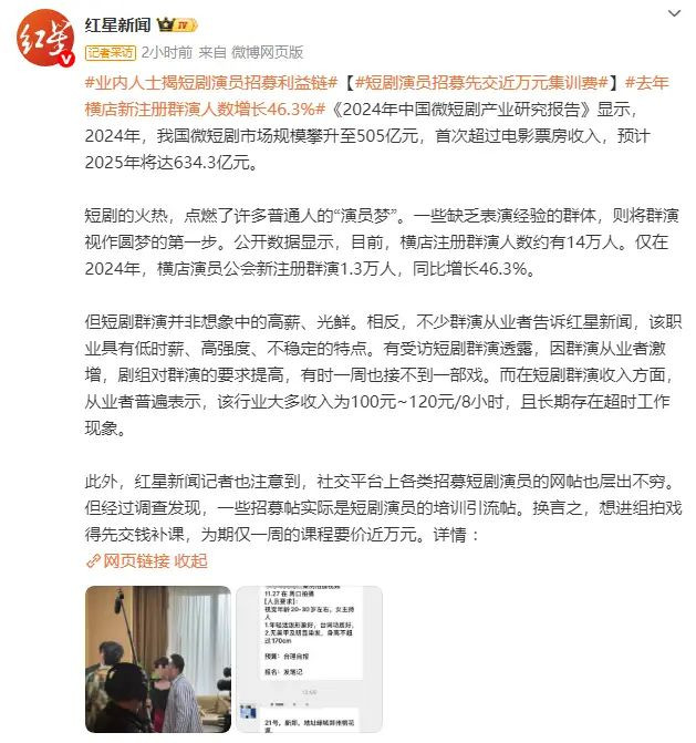 但短剧群演并非想象中的高薪、光鲜。相反,不少群演从业者告诉红星新闻,该职业具有低时薪、高强度、不稳定的特点。有受访短剧群演透露,因群演从业者激增,剧组对群演的要求提高,有时一周也接不到一部戏。而在短剧群演收入方面,从业者普遍表示,该行业大多收入为100元~120元/8小时,且长期存在超时工作现象。
