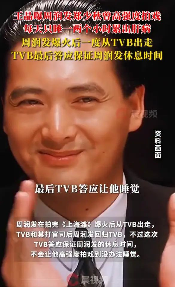 12月5日,潇湘晨报综合,王晶发视频谈周润发,他爆料,之前周润发和郑少秋每三个月轮流演男主,当男主的时候每天基本只睡一两个小时,两个人都被累得得了肝病。周润发在拍完《上海滩》爆火后从TVB出走,TVB和其打官司后周润发回归TVB,不过这次TVB答应保证周润发的休息时间,不会让他高强度拍戏到没办法睡觉。
