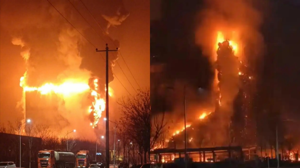 网传的视频显示,一栋高层建筑被明火包围,现场火势凶猛,大火熊熊燃烧,并伴随着滚滚浓烟,楼体不时有燃烧物坠落到地面,整个夜空被照亮。