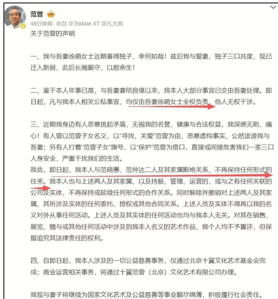 他表示,自己年事已高,今后所有事务都将交由妻子徐萌打理。为了彻底表明心意,范曾采取了多重行动。