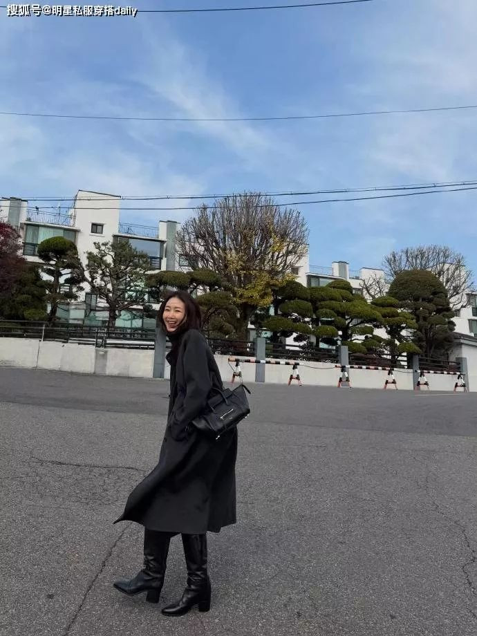 对于像崔智友这样身高有优势的女性来说,长款的深灰色大衣,搭配高跟长筒靴,显得更加高挑。