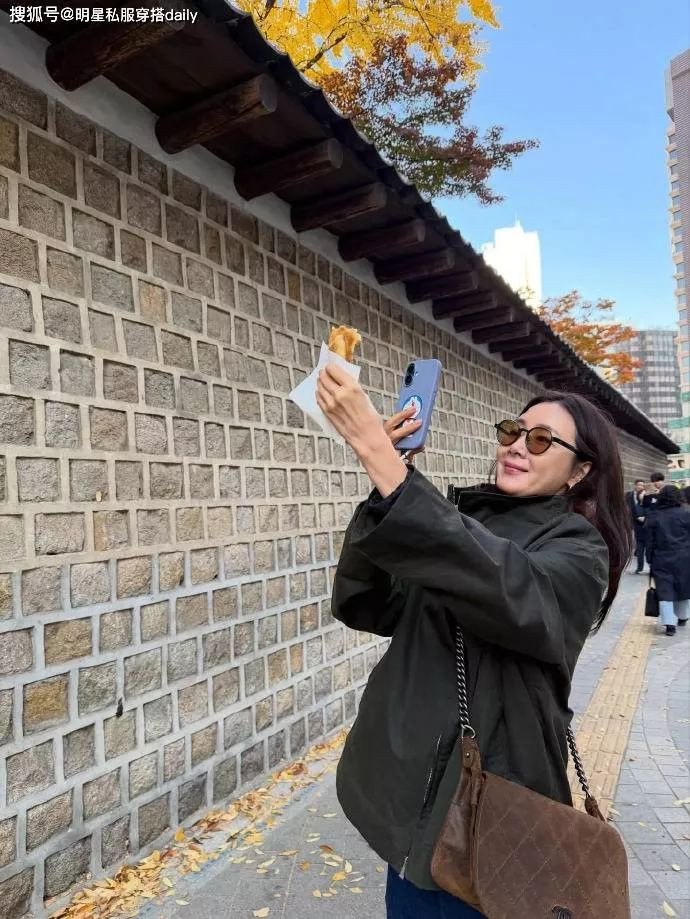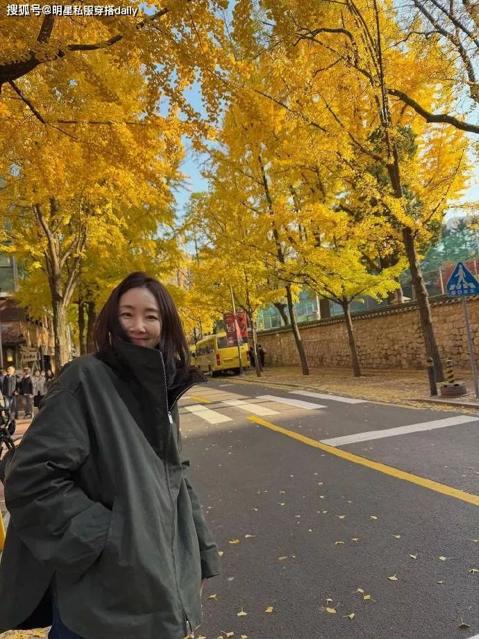 崔智友身穿一款军绿色短款风衣外套,搭配蓝色牛仔裤,帅气又成熟明媚,搭配棕色复古斜挎包,给人一种温婉、知性的感觉。
