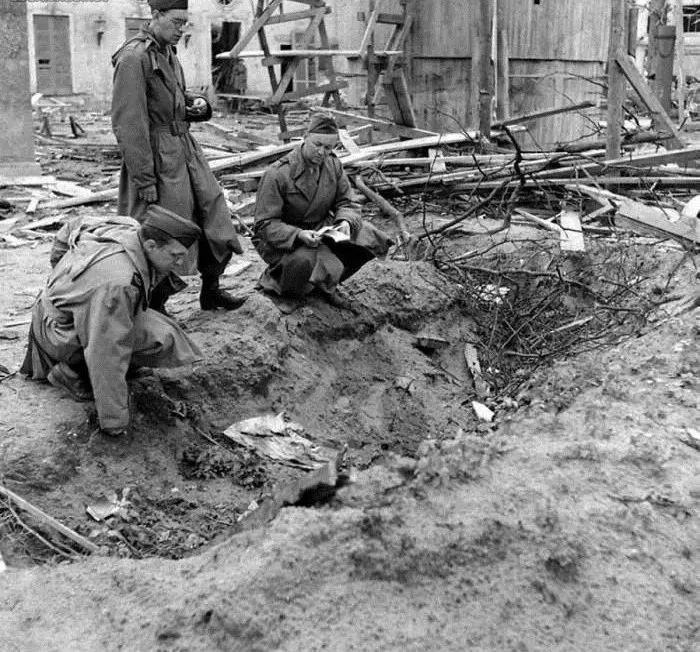 战地记者Percy Knauth,正在检视总理府花园的浅沟,相信这里是希特勒与情妇被火化的地方。