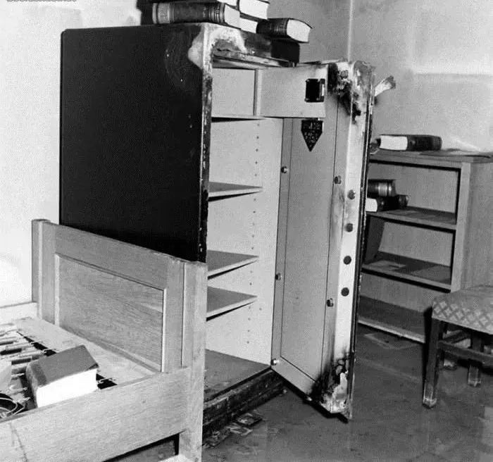 地下室内一个破烂、空置的保险柜。