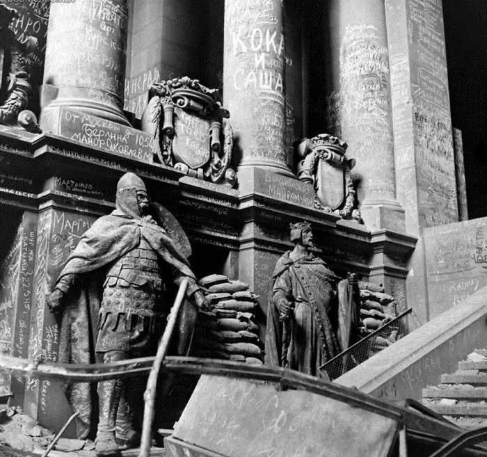 苏联红军与一名平民在搬动纳粹鹰徽,这徽号曾挂在总理府门上。