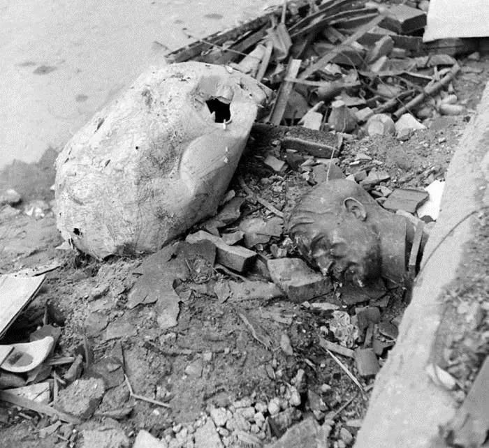 一个粉碎的希特勒像与地球仪,完美的比喻了实况。