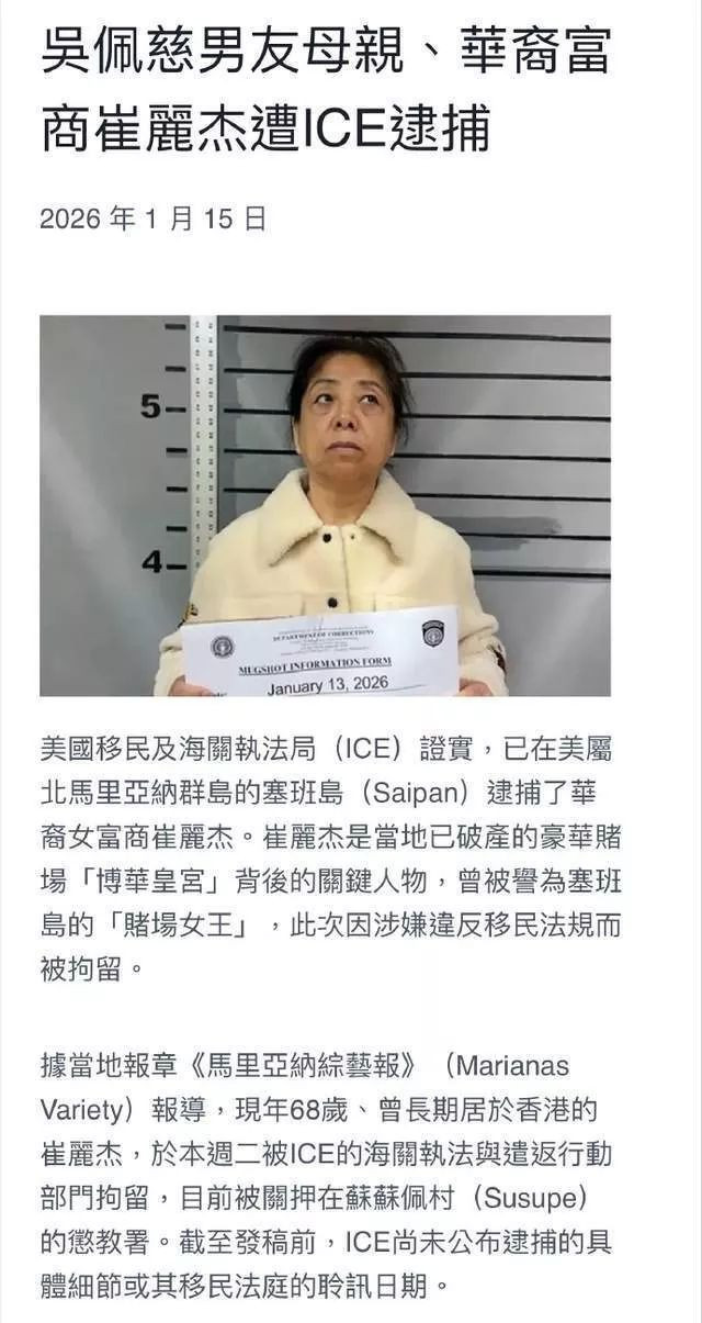 据外媒报道,吴佩慈男友纪晓波的母亲崔丽杰在塞班岛被美国移民与海关执法局拘留,涉嫌违反移民法规,目前被关押在惩教署等待聆讯。