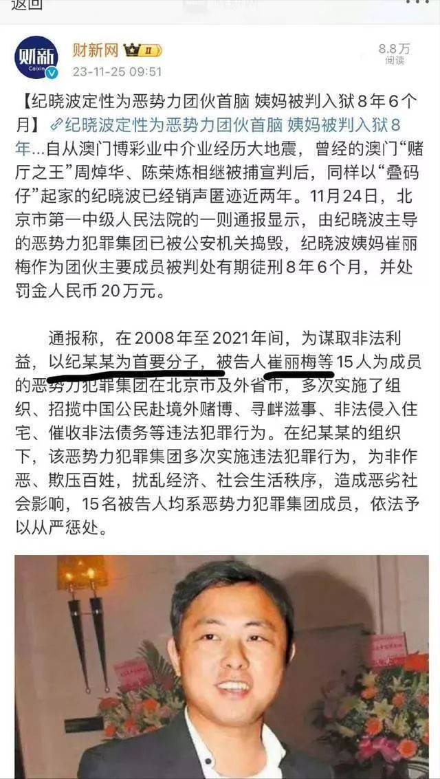 不过,2023年,纪晓波的姨妈崔丽梅就因开设赌场、寻衅滋事等罪名被判刑。