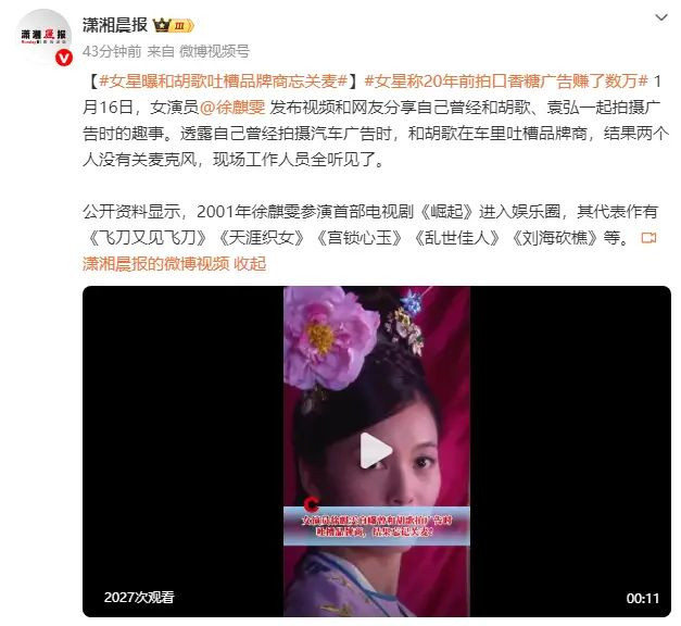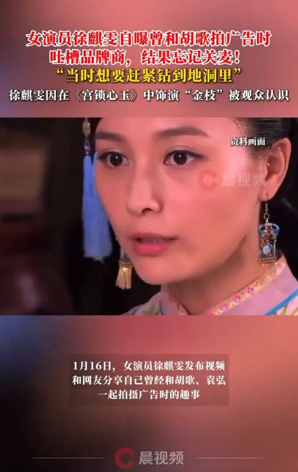 1月16日,女演员徐麒雯发布视频和网友分享自己曾经和胡歌、袁弘一起拍摄广告时的趣事。她透露自己曾经拍摄汽车广告时,和胡歌在车里吐槽品牌商,结果两个人没有关麦克风,现场工作人员全听见了。
