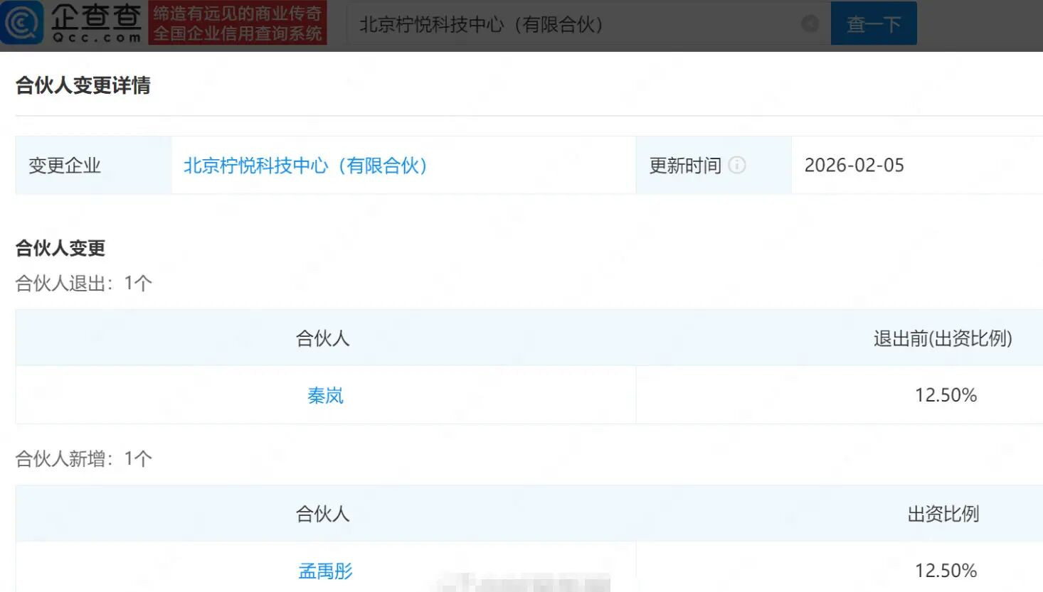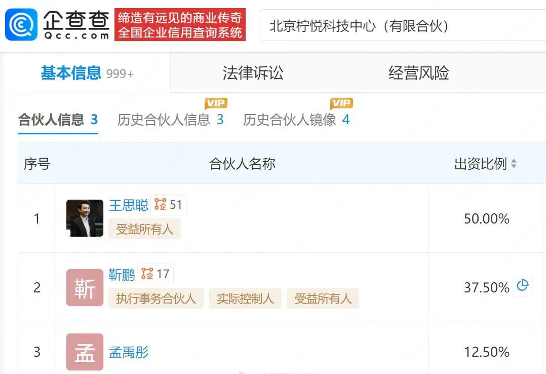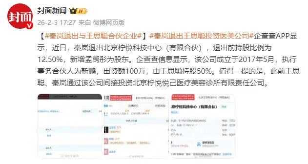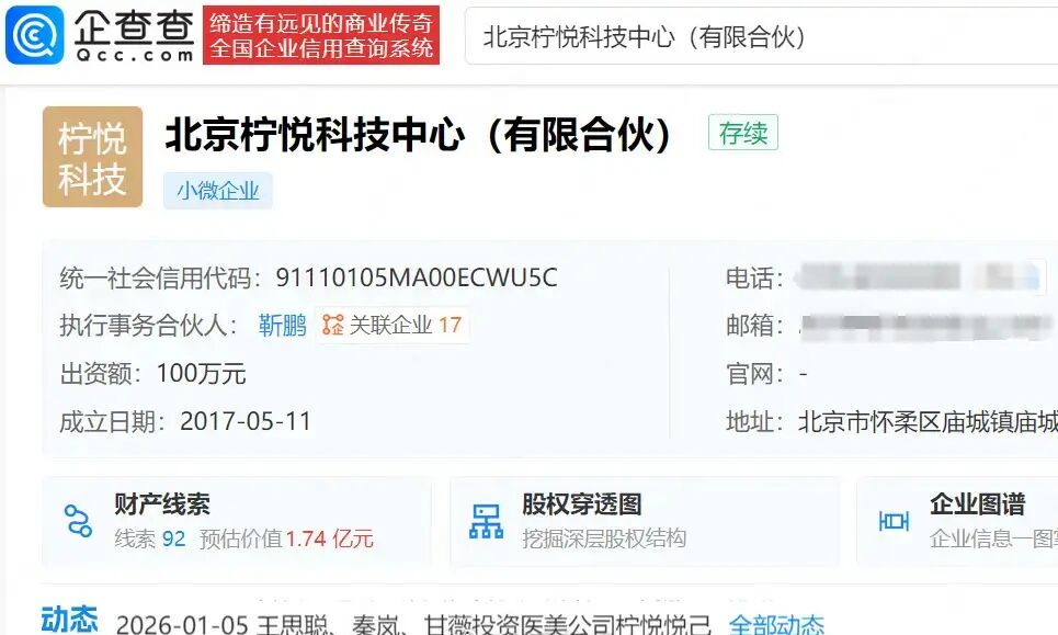 企查查APP显示,近日,秦岚退出北京柠悦科技中心(有限合伙),退出前持股比例为12.50%,新增孟禹彤为股东。企查查信息显示,该公司成立于2017年5月,执行事务合伙人为靳鹏,出资额100万,由王思聪持股50%。值得一提的是,此前王思聪、秦岚通过该公司间接投资北京柠悦悦己医疗美容诊所有限责任公司。