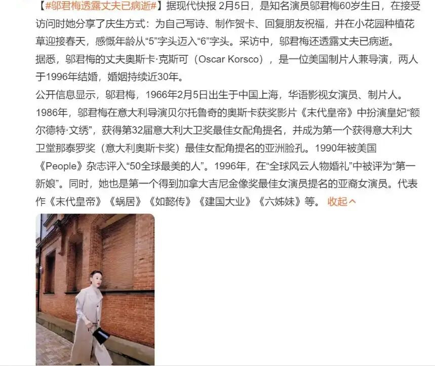 2月6日,邬君梅迎来自己60岁的生日,这原本是一件值得庆祝的事,但她在采访中透露丈夫已去世的消息,让不少人感到意外和惋惜。外界熟知她与外籍丈夫奥斯卡的感情维系了三十多年,两人相互陪伴、事业上也常有合作,如今的这份离别格外令人动容。