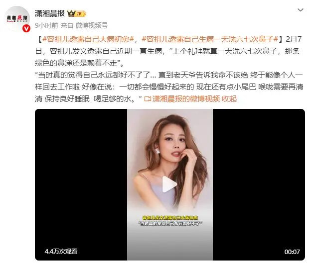 2月7日,容祖儿发文透露自己近期一直生病,“上个礼拜就算一天洗六七次鼻子,那条绿色的鼻涕还是赖着不走”。