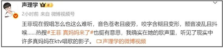 在直播当晚,声理学吐槽王菲假唱难听,音色苍老且疲劳,咬字含糊且变形,颤音凌乱且抖喉,可谓是毒辣。面对“王菲真妈妈来了”的热搜也集中火力,表示在王菲的歌声里听到了许多妈妈在KTV唱歌的影子,内涵王菲演唱水平跟普通妈妈KTV水平一样。
