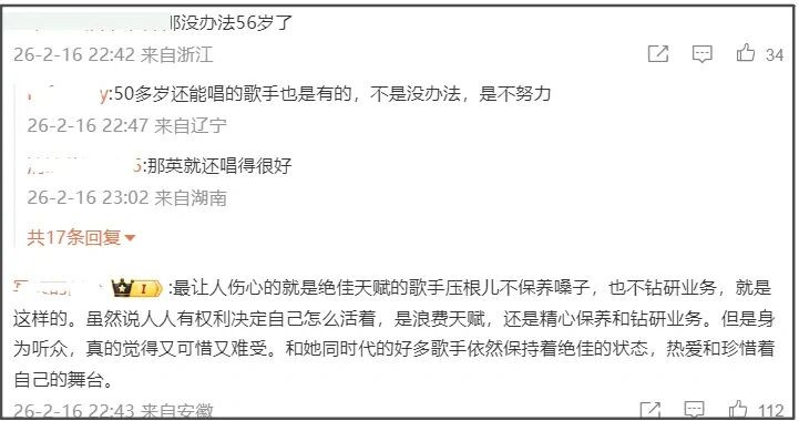 不少粉丝看到乐评人的严苛,纷纷拿年龄挽尊,表示“没办法56岁了”。反驳的网友则举例称很多同龄歌手都很能唱,认为王菲懈怠了,长年不精修业务也不保护嗓子,所以水平下降很快,为之惋惜。
