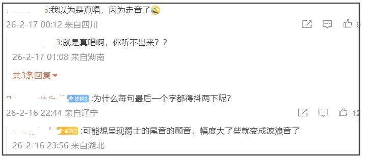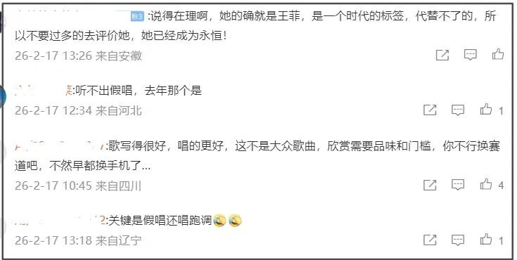 而还有部分网友因为王菲走音误认为她真唱,这也是许多观众的误区,常把难听当成真唱的佐证。