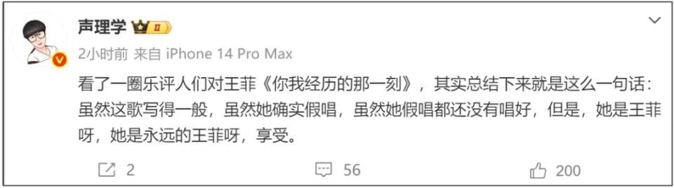许是评论区的网友都比较善良,没有出现一边倒的吐槽。声理学又发了第二篇嘲讽,他内涵其他乐评人对王菲的包容,容忍王菲假唱、走音等错误,还要坚称“她是王菲,永远的王菲”,做出享受状。