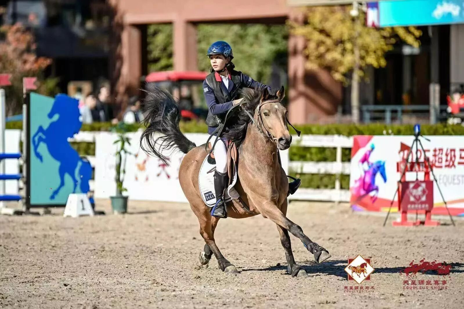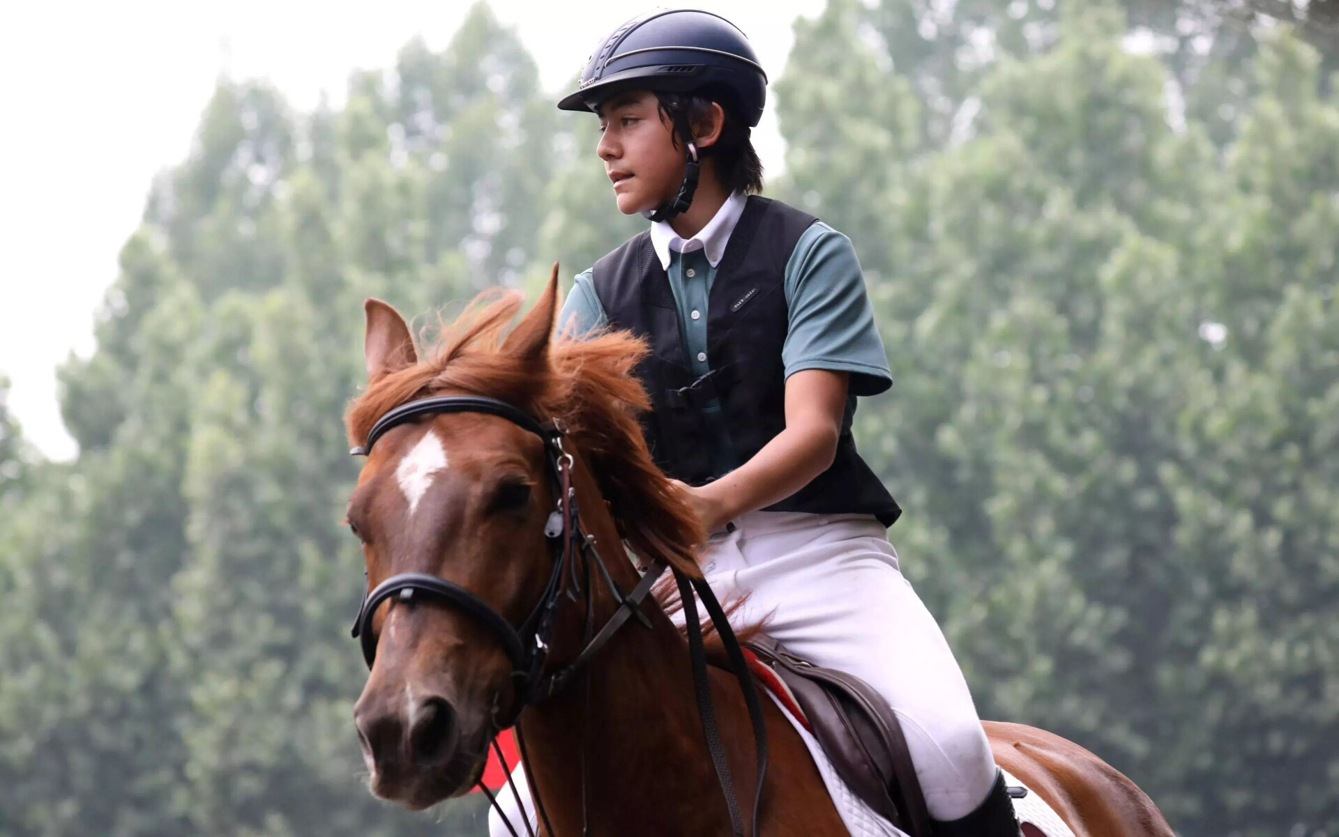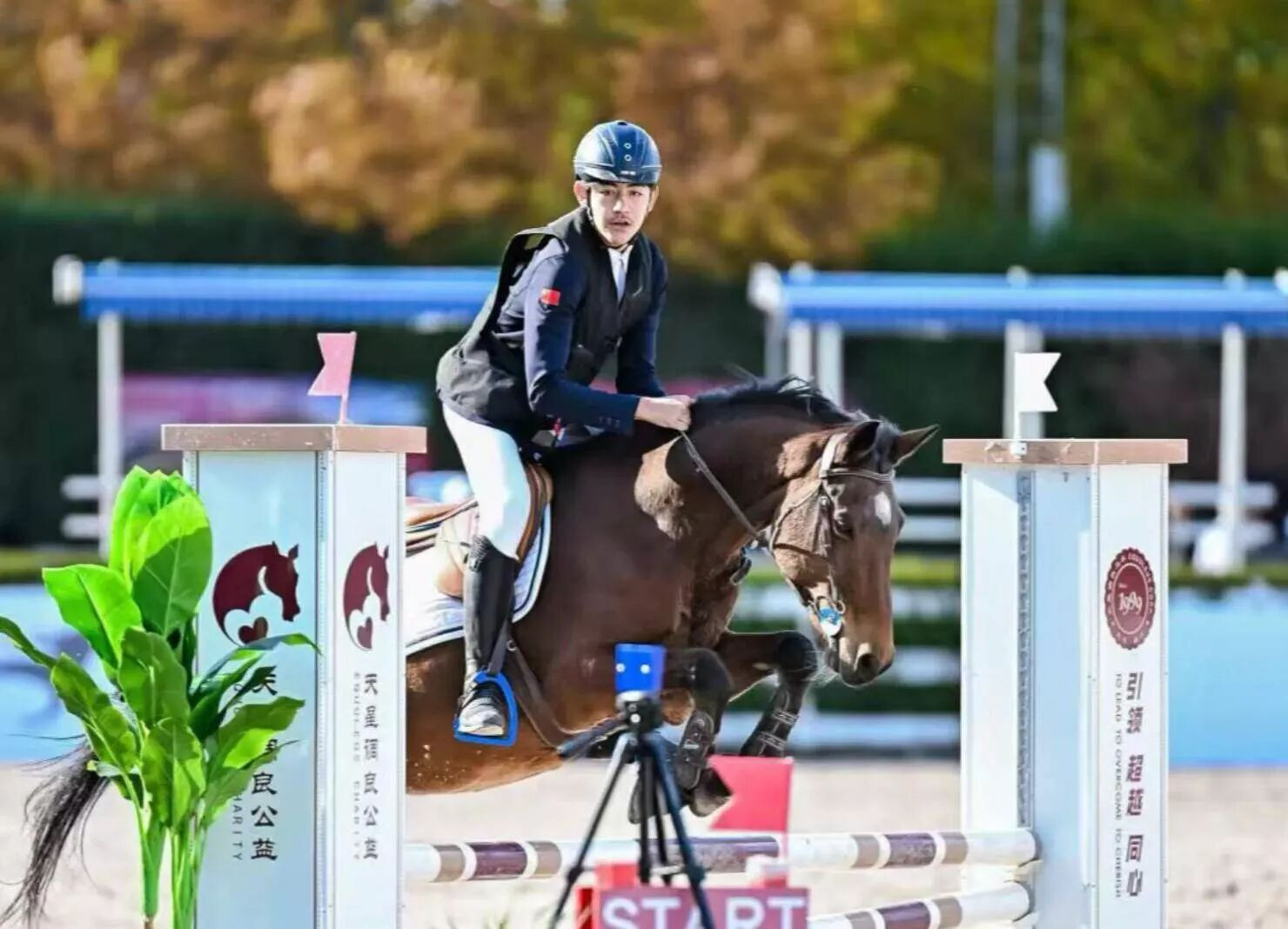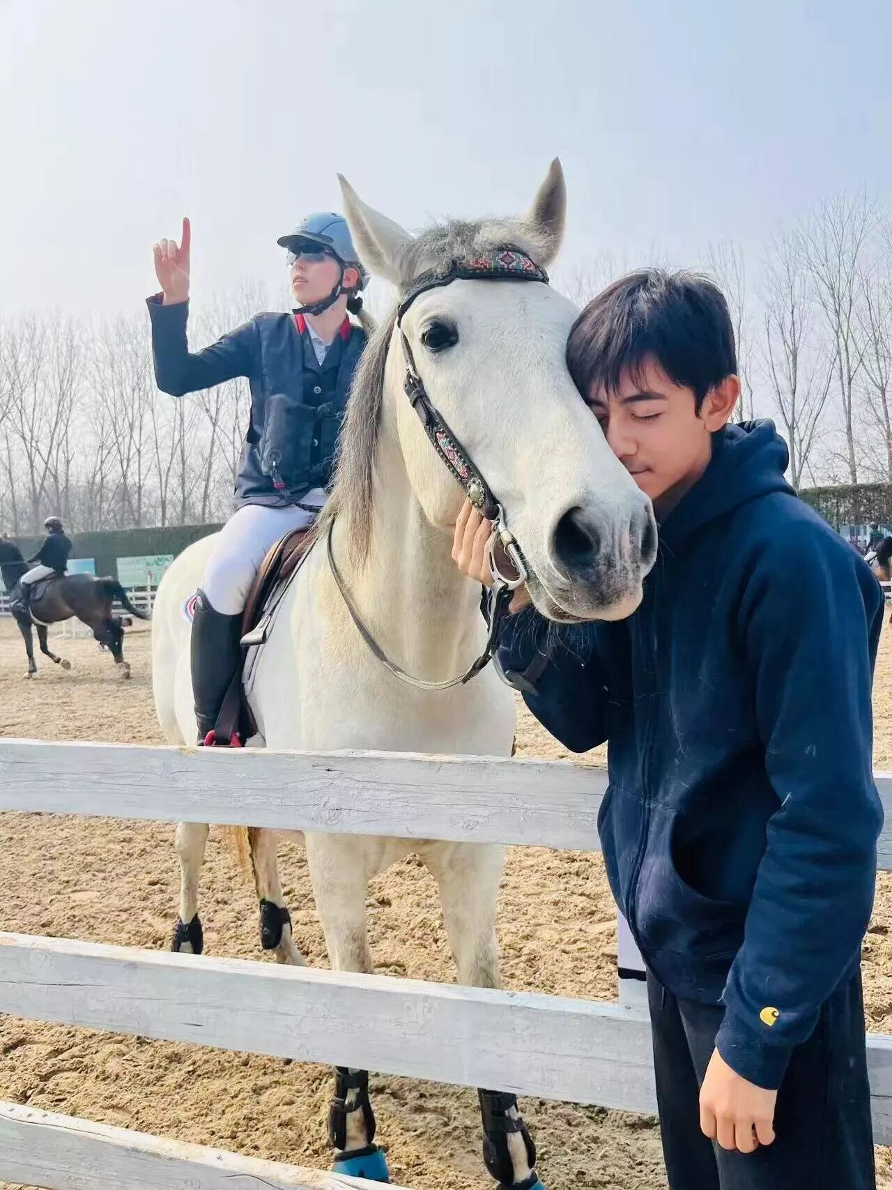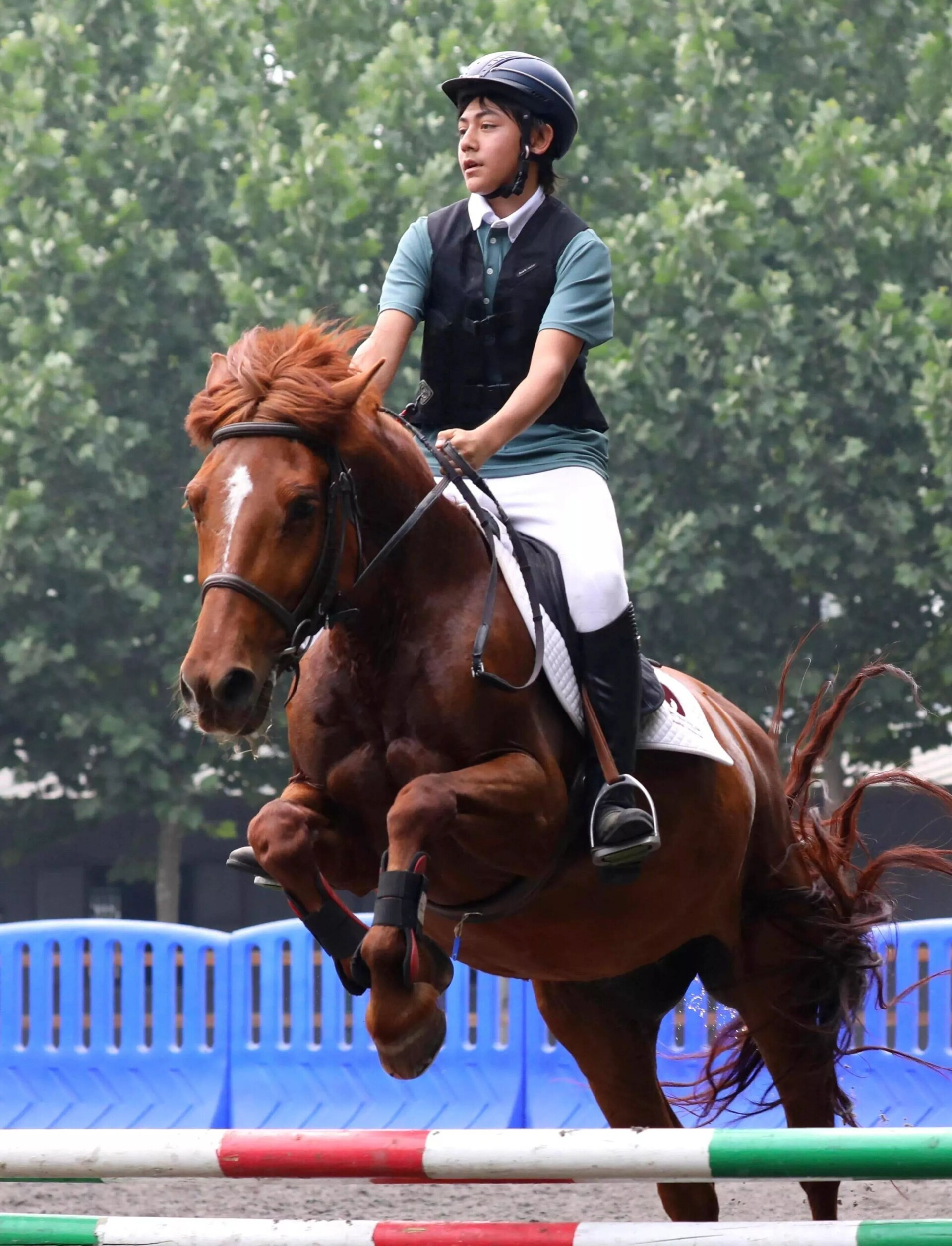 照片中,诺一身穿深蓝色骑手服,戴着专业头盔,眼神专注而坚定,骑在马背上的他在障碍前腾空而起,动作利落帅气,真的好酷。在马术考级大赛中,诺一还拿了亚军,看来实力真的很强呀。