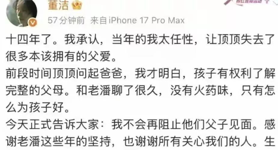 转机出现在2023年。顶顶14岁生日那天,潘粤明第一次在微博晒出了父子合影。他@了董洁。三分钟后,董洁转发了,说:“他一定会越来越好。”两人微博互关。网友把这次互动称为“世纪和解”。