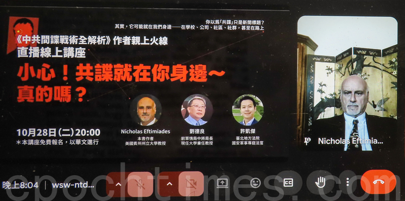 《中共间谍战术全解析》线上座谈会邀请《中共间谍战术全解析》作者──前CIA情报官尼可拉斯‧艾夫提米亚迪斯(Nicholas Eftimiades),以及台北地方法院国安军事专庭法官许凯杰、中华民国前军情局中将局长刘德良教授,共同分享“防谍”的制度挑战与实务经验。(相关文章:专家:台湾破获的共谍案很少 应加强反渗透教育)