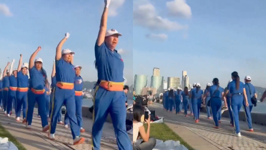 11月11日,有网友发布视频显示,中国“暴走团”现身香港,一群中老年人在维多利亚港沿岸徒步,队伍中播放的高分贝音乐引发路人侧目,不少在海边休息的游客因被噪音干扰,脸上露出厌烦的表情。
