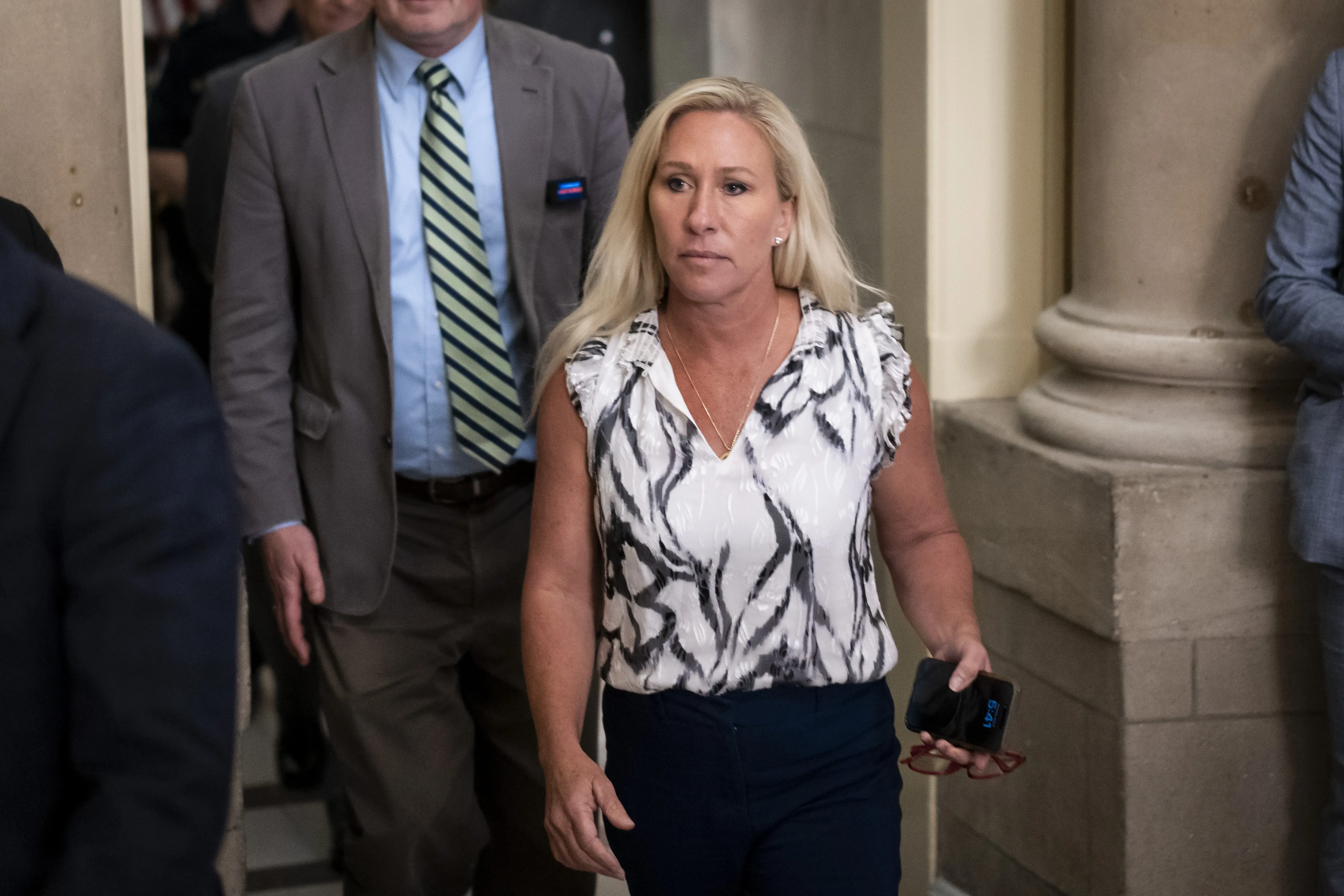 川普宣布撤回对共和党众议员格林的支持。图为2024年5月6日,在华盛顿特区国会山,乔治亚州共和党众议员玛乔丽‧泰勒‧格林(Marjorie Taylor Greene)在参加一次会议后离开众议院议长迈克·约翰逊的办公室。(Madalina Vasiliu/The Epoch Times)