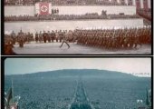 照片是由希特勒的私人摄影师Hugo Jaeger拍摄的,二战快结束时Jaeger为避免祸害,把这些彩色胶片放在一只玻璃罐里,埋在慕尼黑郊外,他因害怕因此受牵连。在战后十年重新挖掘出来这些照片,卖给了LIFE杂志。照片里应了那句“国富民强,军队强大”,可是...